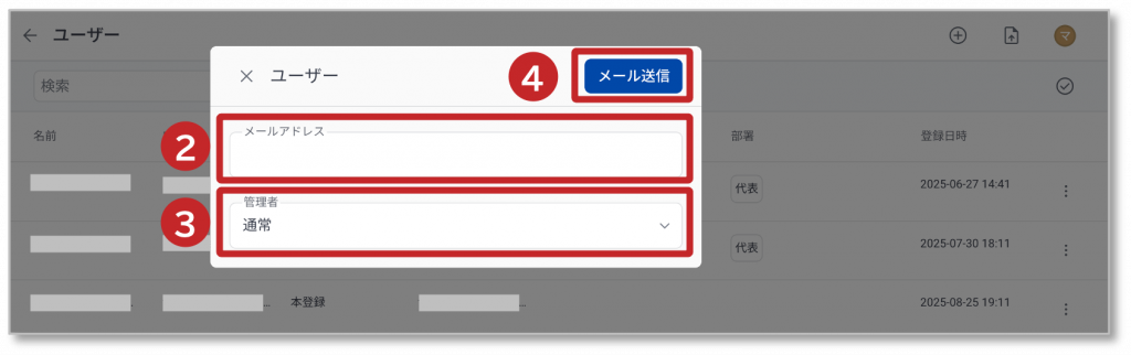 ④ 「メール送信」をクリックして、追加するユーザーにメールを送信します。