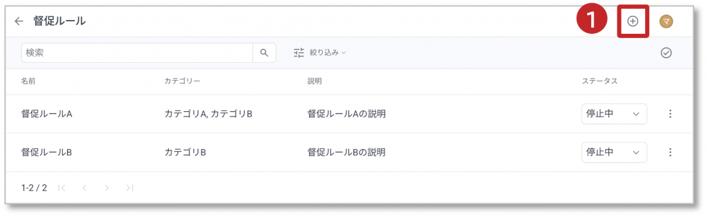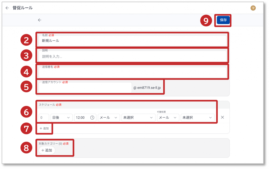操作メニュー 督促ルール 7. 督促ルールの追加 督促ルールの追加方法について説明します。 ① 「+」をクリックし、督促ルールを追加します。 ② 「名前(必須)」を入力します。③ 「説明(任意)」を 入力します。④ 送信者名(必須)を入力します。⑤ 「送信者アカウント(必須)を入力します。⑥ 「スケジュール(必須)」を設定します。⑦ 「+追加」をクリックして、スケジュールを追加します。⑧ 対象カテゴリー(必須)」をクリックして、対象カテゴリを追加します。⑨ 「保存」をクリックして、督促ルールを追加登録します。
