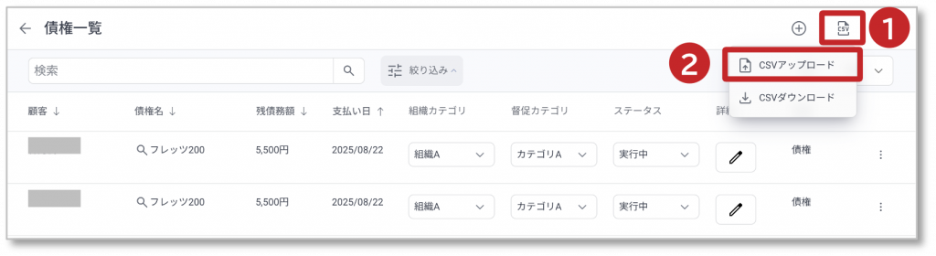 ① 「CSVアイコン」をクリックすると、CSVアップロード、CSVダウンロードの選択メニューが表示されます。