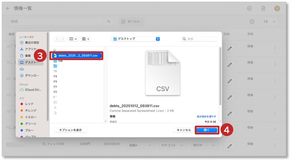 ④ 「開く」をクリックするとCSVファイルがアップロードされます。