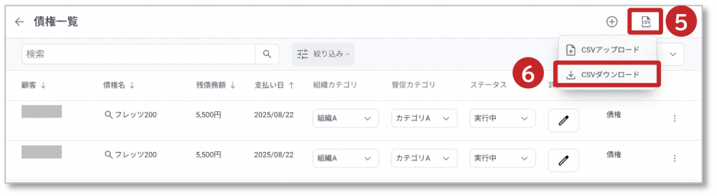 ⑤ 「CSVアイコン」をクリックすると、CSVアップロード、CSVダウンロードの選択メニューが表示されます。