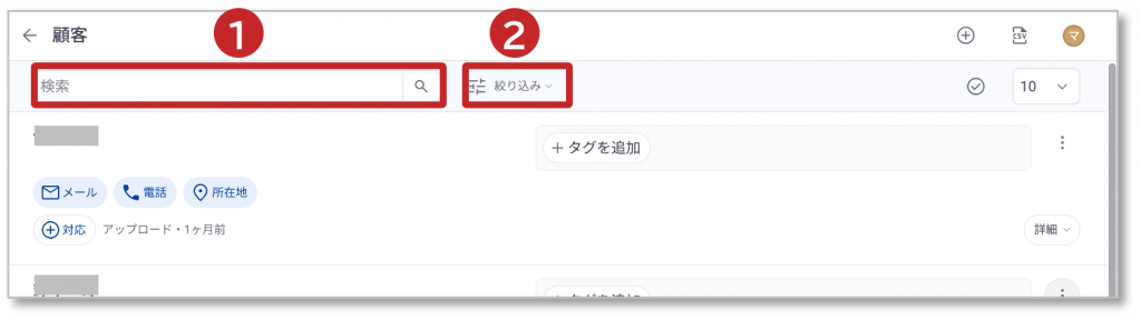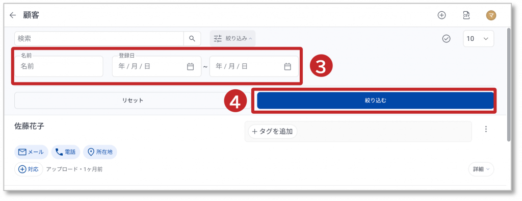 管理者メニュー 部署 10. 顧客の絞り込み 顧客の絞り込み方法について説明します。 ① 「検索ワード入力欄」に検索ワードを入力して、「虫眼鏡アイコン」をクリックして顧客を絞り込みます。② 「絞り込み」をクリックして、情報項目を選択し、顧客を絞り込みます。 ③ 絞り込みに必要な条件を入力、選択します。④ 「絞り込む」をクリックして、絞り込み条件に合致した顧客情報が絞り込まれます。