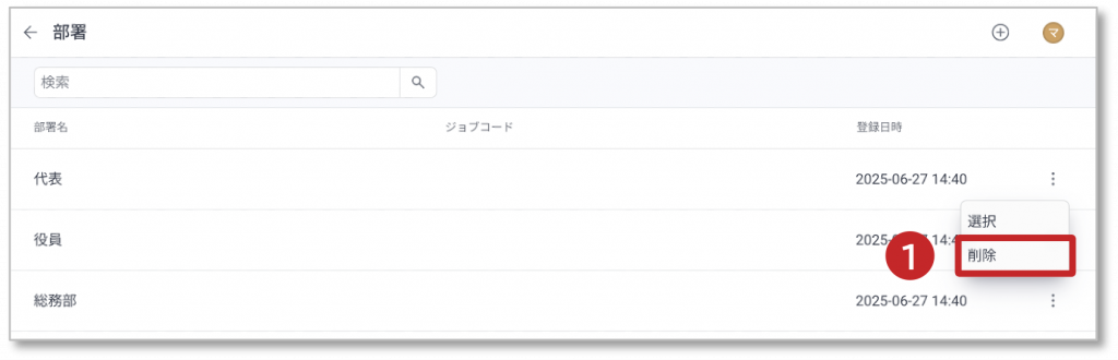 管理者メニュー 部署 3. 部署の削除 部署の削除方法を説明します。 ① 「︙」をクリックし、「削除」をクリックします。 ② ダイアログが表示され、「削除」をクリックすると、選択された部署が削除されます。