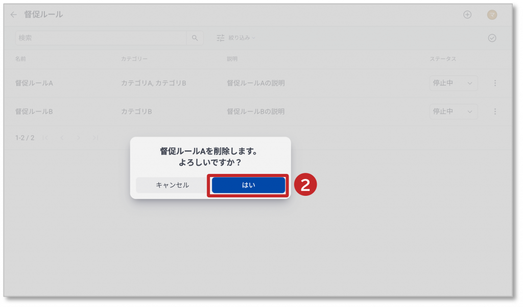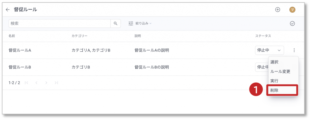 操作メニュー 督促ルール 6. 督促ルールの削除 督促ルールの削除方法について説明します。 ① 「︙」をクリックし、「削除」をクリックします。 ② ダイアログが表示され、「はい」をクリックすると、対象の督促ルールが削除されます。