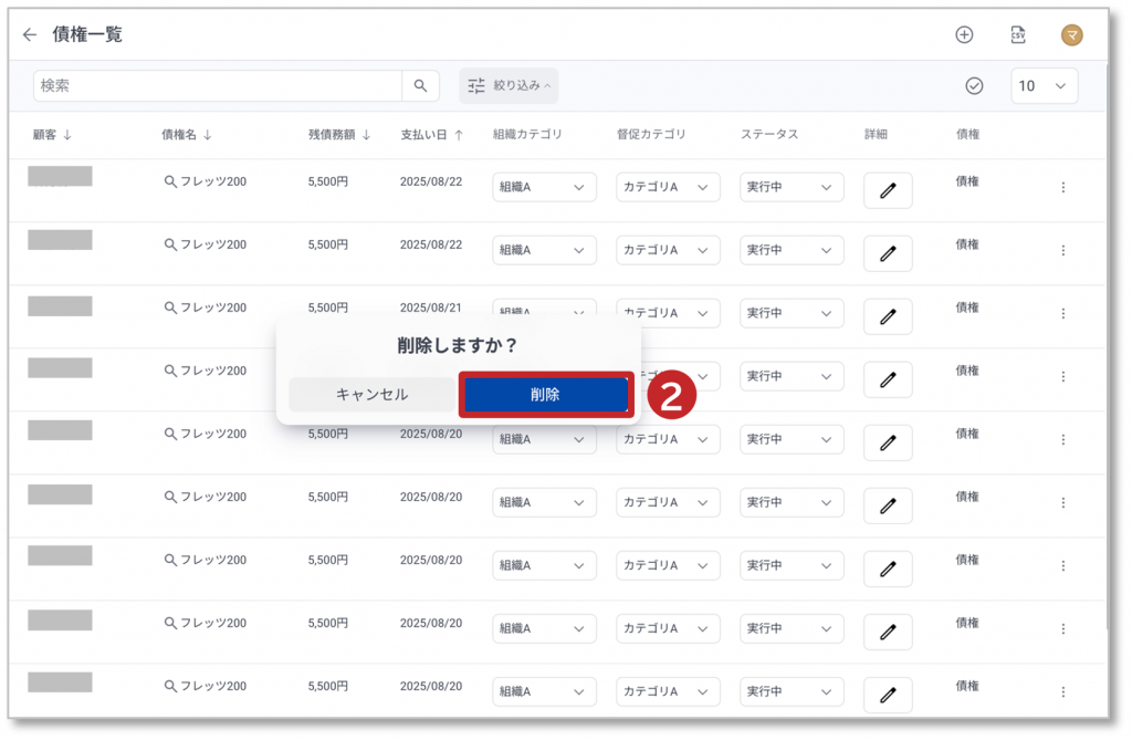 操作メニュー 債権一覧 6. 債権情報の削除 債権情報の削除方法について説明します。 ① 「︙」をクリックし、「削除」をクリックします。 ② ダイアログが表示され、「削除」をクリックすると、選択した債権情報が削除されます。