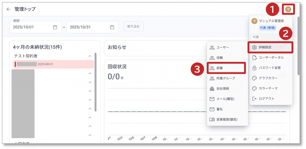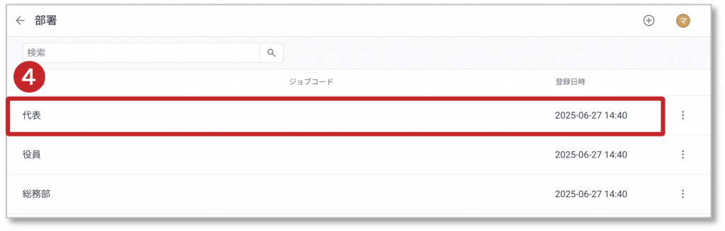 ③ 表示されたメニューの「部署」をクリックして部署画面を表示します。