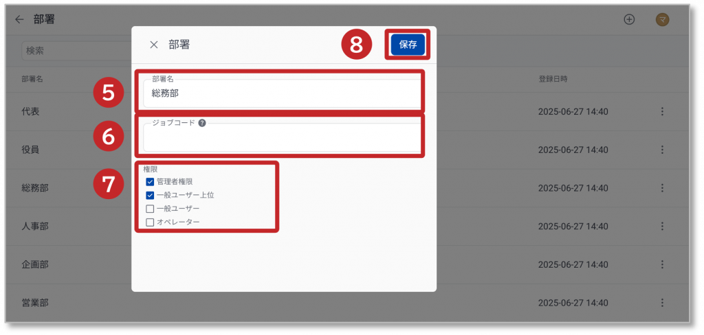 ⑧ 「保存」をクリックすると、編集した 部署情報が登録されます。