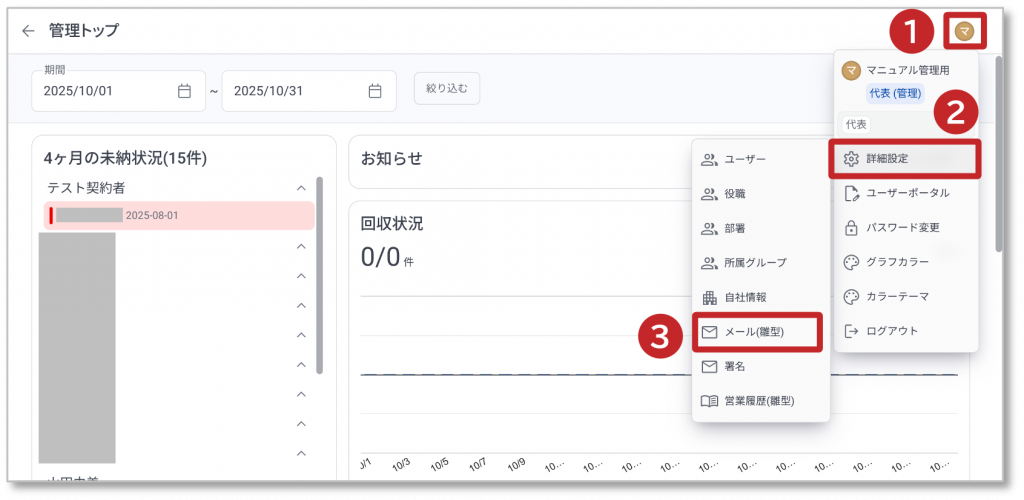 ③ 表示されたメニューの「メール(雛形)」をクリックしてメール(雛形)画面を表示します。