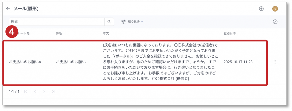 ④ 赤枠エリアをクリックすると、メール(雛形)情報がダイアログで表示されます。