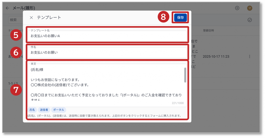 ⑧ 「保存」をクリックすると、編集したメール(雛形)情報が登録されます。
