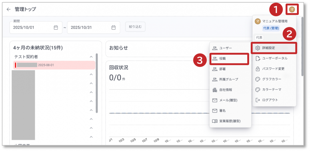 ③ 表示されたメニューの「役職」をクリックして役職画面を表示します。