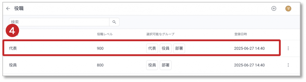 ⑥ 「役職レベル」が表示されます。(「役職レベル」の数値が高い方が権限レベルが上位となります。)