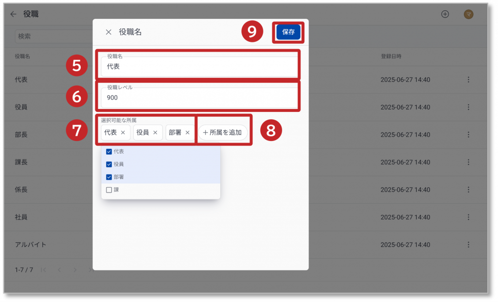 ⑨ 「保存」をクリックすると、編集した役職情報が登録されます。