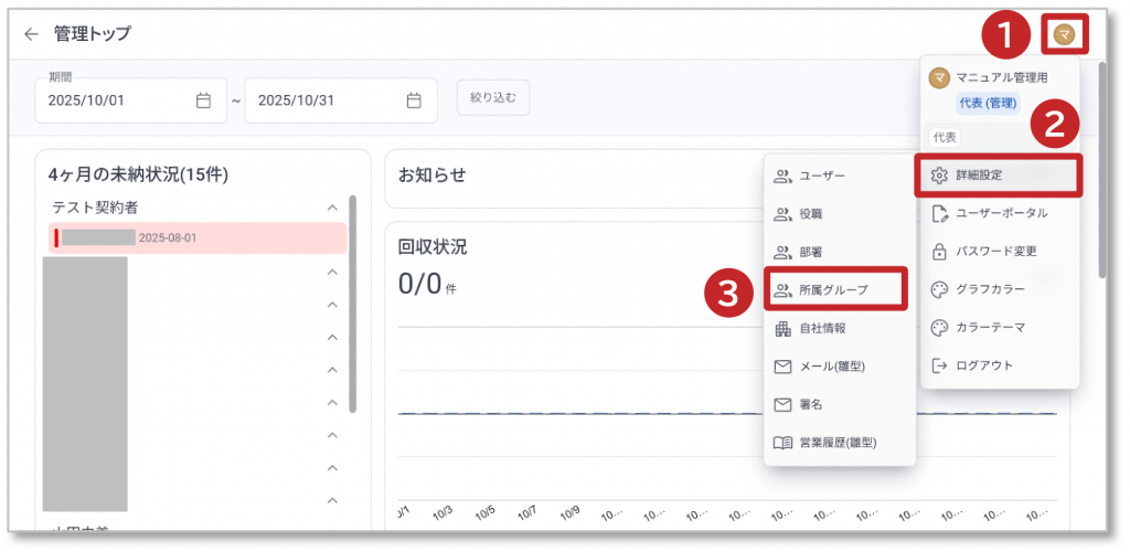 ③ 表示されたメニューの「所属グループ」をクリックして所属グループ画面を表示します。