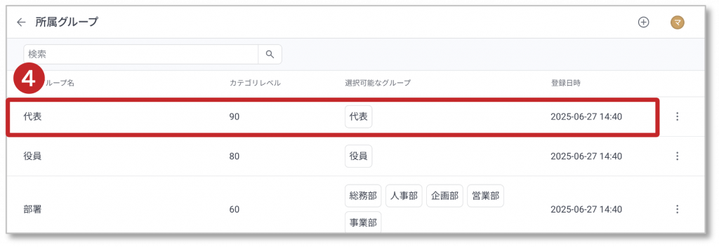 ⑥ 「レベル」が表示されます。(「レベル」は数字が大きい方が権限が上位になります。)