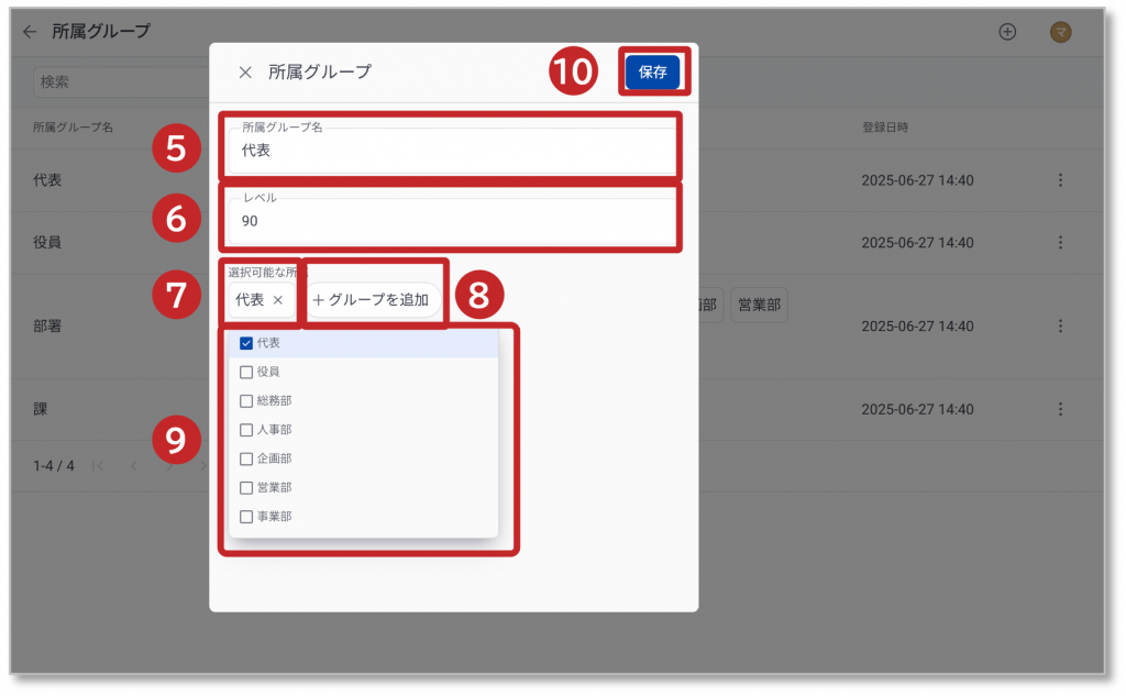 ⑩ 「保存」をクリックすると、編集した 所属グループ情報が登録されます。