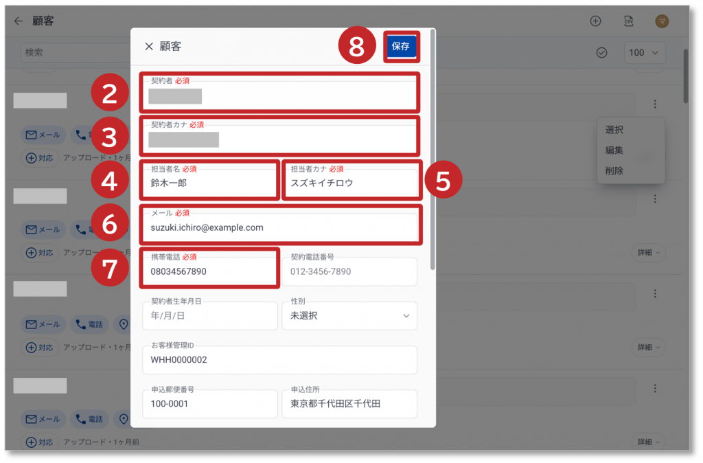 操作メニュー 顧客 6. 顧客情報の編集 顧客情報の編集方法について説明します。 ① 「︙」をクリックし、「編集」をクリックします。 「必須情報」は必ず記載して登録します。 ※「必須」と記載されていない情報は任意情報となります。② 契約者の氏名を記載します。(必須)③ 契約者の氏名をカナで記載します。(必須)④ 担当者の氏名を記載します。(必須⑤ 担当者の氏名をカナで記載します。(必須)⑥ メールを記載します。(必須)⑦ 携帯電話番号を記載します。(必須)⑧ 「保存」をクリックして編集した情報を保存します。