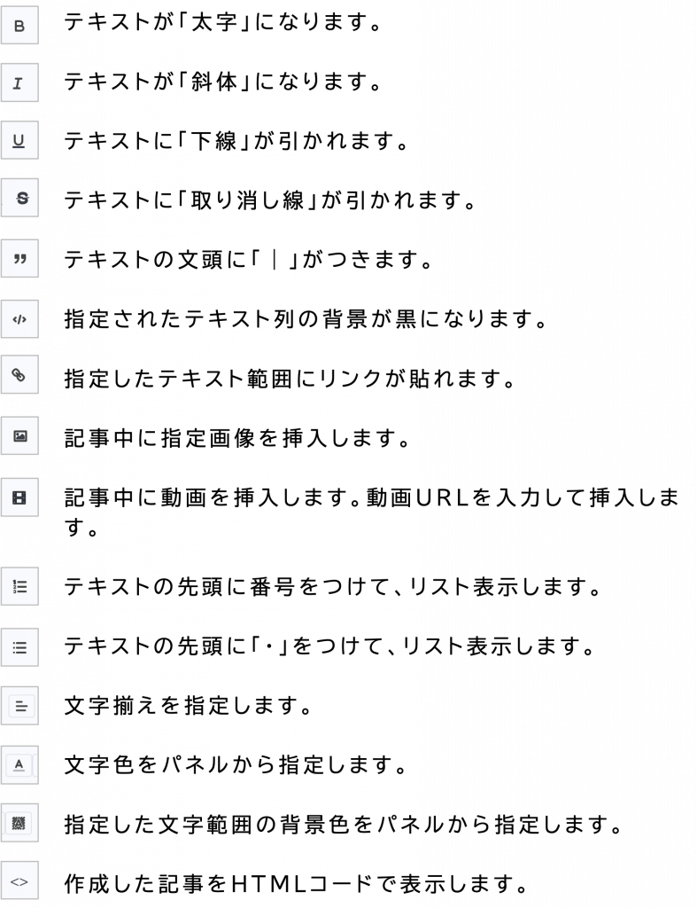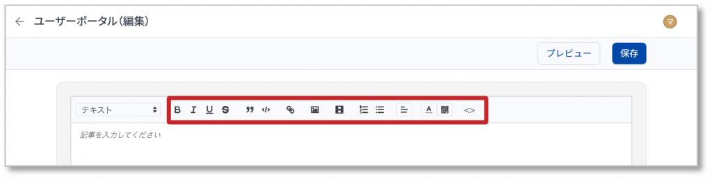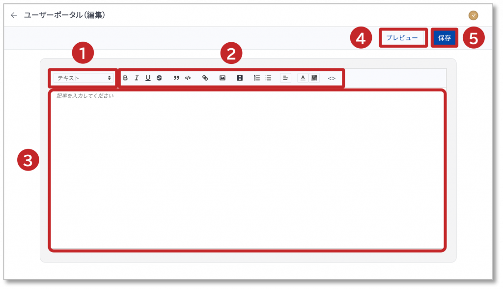 管理者メニュー ユーザーポータル 2. ユーザーポータルの編集 ユーザーポータルの編集方法を説明します。 ① 入力するテキストのレベルを「見出し_h2、サブ見出し_h3、テキスト」から指定します。② 入力情報のスタイルをそれぞれのアイコンから指定します。(それぞれのアイコンの説明はページ下部をご参照ください。)③ 記事を入力します。④ 「プレビュー」をクリックして、入力した記事を画面で確認します。⑤ 「保存」をクリックして、設定した記事を登録します。