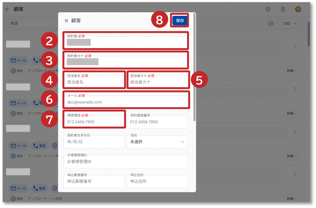 ① 「+」をクリックすると、顧客情報の登録画面が表示されます。