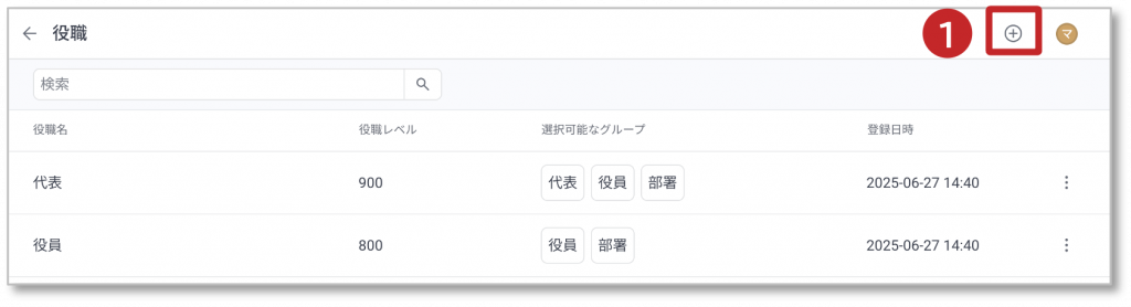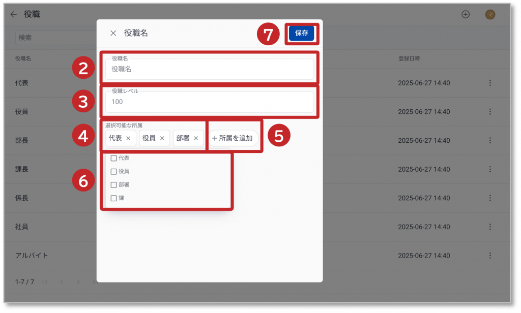 管理者メニュー 役職 4. 役職の登録 役職の登録方法を説明します。 ① 「+」アイコンをクリックすると、ダイアログで追加登録画面が表示されます。 ② 「役職名」を入力します。③ 「役職レベル」を入力します。④ 「選択可能な所属」が表示されます。「×」をクリックすると選択されている所属が削除されます。⑤ 「+所属を追加」をクリックすると所属選択が表示されます。⑥ 表示された所属から選択して所属を追加します。⑦ 「保存」をクリックすると、設定した役職情報が登録されます。