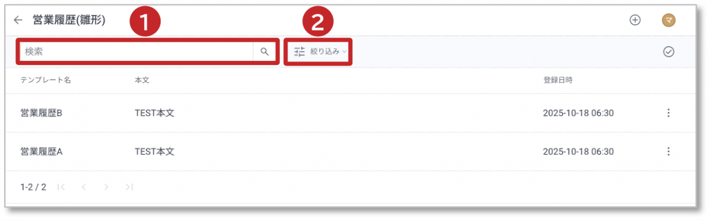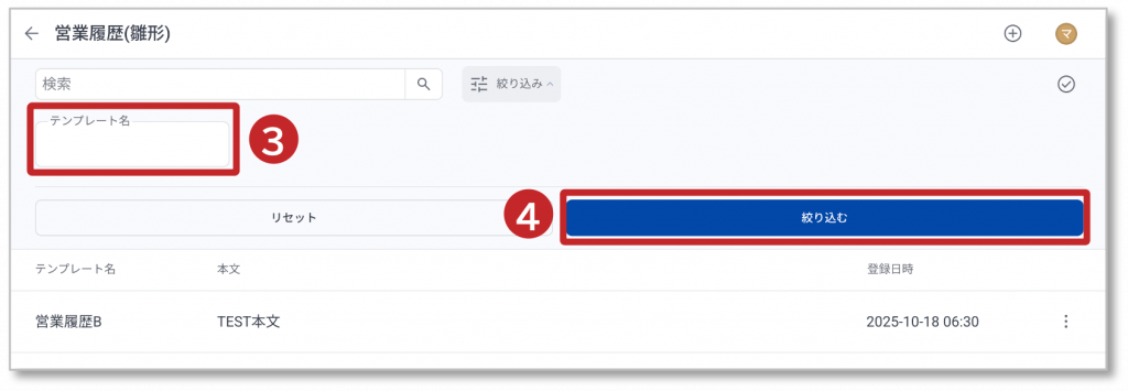 管理者メニュー 営業履歴(雛形) 5. 営業履歴(雛形)の検索 営業履歴(雛形)の検索方法を説明します。 ① 「検索キーワード欄」に検索ワードを入力して「虫眼鏡アイコン」をクリックします。② 「絞り込み」をクリックして、情報項目を選択し、情報を絞り込みます。 ③ 「テンプレート名」を入力します。④ 「絞り込む」をクリックして、絞り込み条件に合致した営業履歴(雛形)が絞り込まれます。