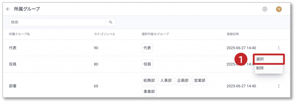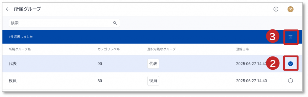③ 「ゴミ箱」アイコンをクリックすると、選択されている所属グループ情報が削除されます。