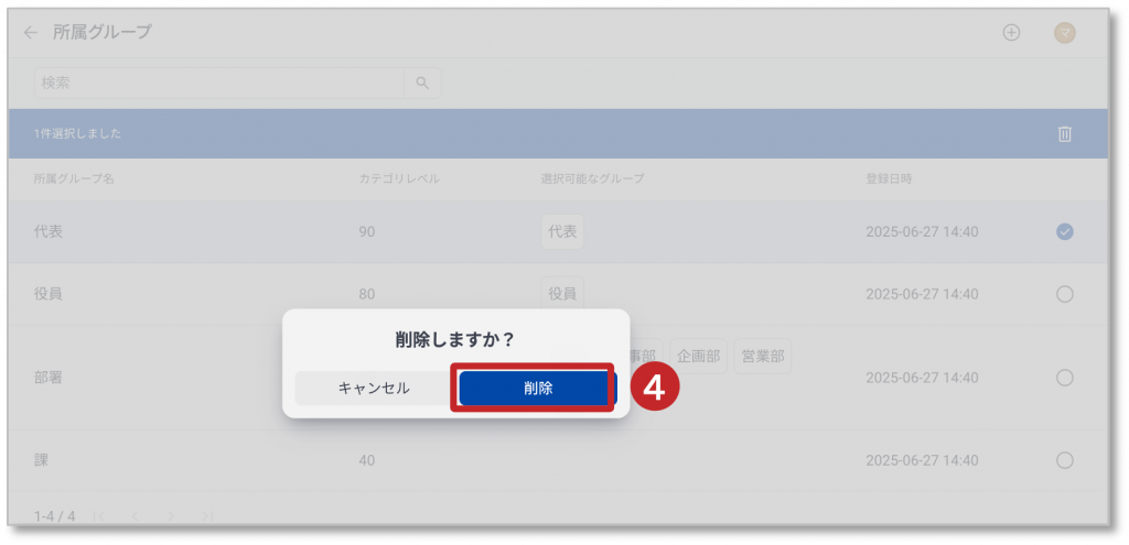 ④ ダイアログが表示され、「削除」をクリックすると、選択された所属グループ情報が削除されます。