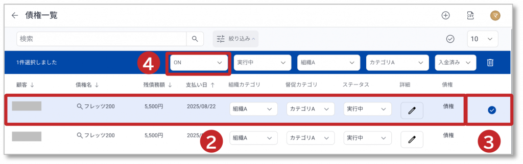 ② 選択した債権情報が色が付きで表示されます。
