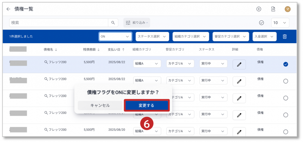 ⑥ ダイアログが表示され、 「変更する」をクリックすると、債権フラグがONに変更されます。