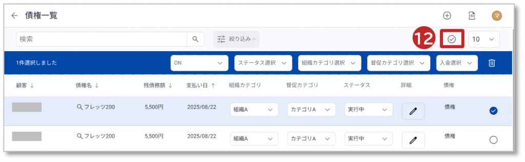 12. 「チェックアイコン」をクリックすると、表示されている全ての債権情報が選択されます。