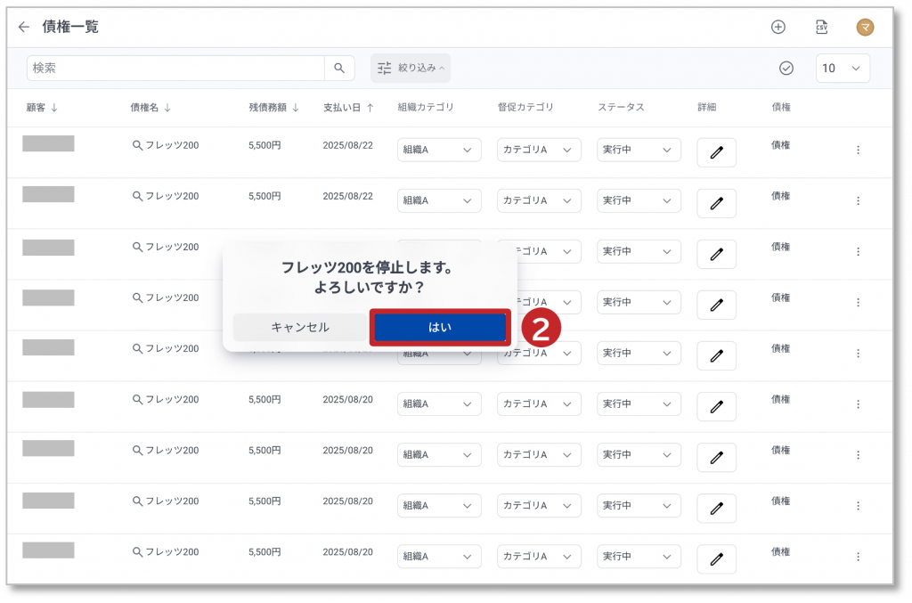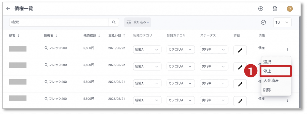 操作メニュー 債権一覧 4. 債権情報の停止 債権情報の停止方法の説明をします。 ① 「︙」をクリックし、「停止」をクリックします。 ② ダイアログが表示され、「はい」をクリックすると、債権を停止します。